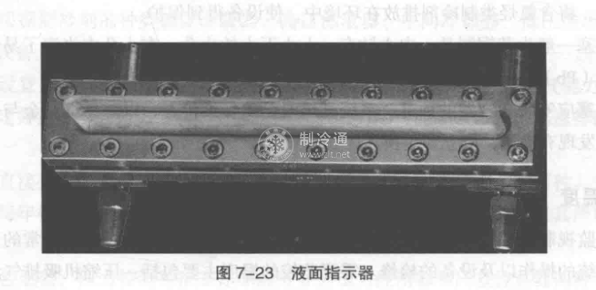 (1)液面指示器(圖7-23)可以直觀地反映液位的高度,一般不具有自動(dòng)控制的功能。-10℃以下一般采用油包式液位指示的方法,在充滿油的視鏡里不會(huì)產(chǎn)生氣泡或結(jié)冰。