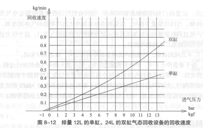 氣態回收速度較慢,適宜于少量制冷劑的回收,或者是不具備液態工藝口或制冷劑回收容器沒有氣液雙閥的情況。一般回收設備的回收速度都是一個恒定的氣體體積量,當壓力下降時,回收速度也會成倍地下降。如圖8-12所示。如對于R410A制冷劑“壓力為1.65MPa時回收速度為800g/min,而壓力為0.1 MPa時回收速度只有48.5g/min。氣態回收時回收容器的溫度上升會較快。