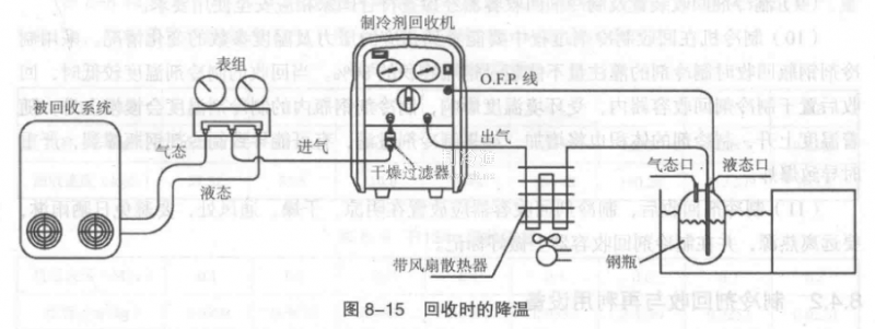 參照此標準,單一的升溫降溫很難作為回收的器具使用,但可以與壓縮機配合使用加快回收速度。在用壓縮機的同時對回收容器降溫或用大散熱器給制冷劑降溫。如圖8-15所示。