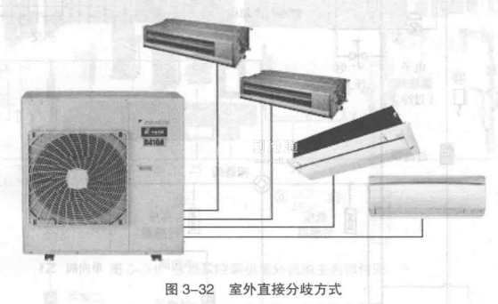 采用室外分歧的多聯式空調系統(圖3-32),其室外機組連接復數組制冷劑配管,數量根據實際連接的室內機組的數量和形式來確定。相對而言,采用室內分支的系統,由于流量調節機構設置在各室內機組中,能較為迅速地對應室內負荷的變化,且可達到較長的配管長度以對應較大的空調空間;而室外分歧的多聯式空調系統由于流量控制機構設置在室外機組,為減小管路的輸送損耗,一般不宜安裝較長的制冷劑配管,多用于三房至四房的家庭場合。
