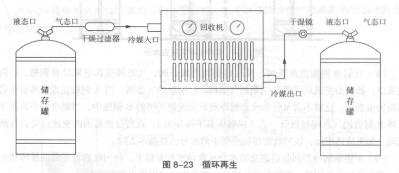 再生時,利用回收裝置內部的油分離器及外部增設的過濾器,將回收的制冷劑在兩個儲存鋼瓶之間通過回收裝置往復轉移、循環,使制冷劑內的油、水分、雜質得到凈化處理,從而保證制冷劑的潔凈度(圖8-23)。