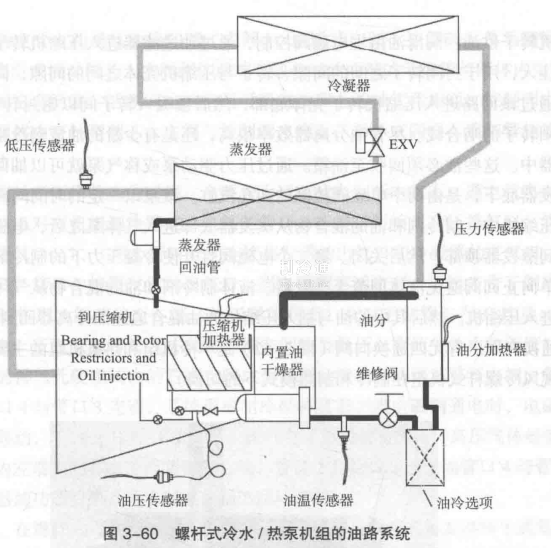圖3-60所示為螺桿式冷水/熱泵機組油路系統。圖中EXV表示電子膨脹閥。