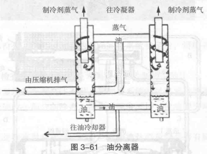油分離器:潤滑油和制冷劑的混合物進入油分離器并在其內部進行旋轉,由于潤滑油較重,所以被甩到桶壁后流到油分離器底部并進入冷卻回路。制冷劑蒸汽由油分離器中部排出后進入冷凝器中(圖3-61)。
