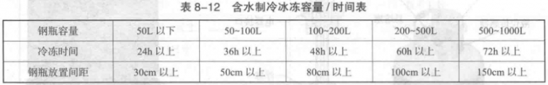 (5)根據單個制冷劑鋼瓶的灌注址來確定需要冰凍的時間.見表8-12。