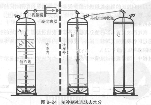 (7)當含水制冷劑鋼瓶完成冰凍過程后(如水分量較多會在制冷劑鋼瓶的液體上表面結成塊狀冰,如制冷劑中水分含量較少時,水分會結成冰珠浮在液體制冷劑表面),按圖8-24方式連接。在過濾器之前管道中可加接一個視液鏡。(當制冷劑中水分含量非常少時干操過濾器能起作用,過濾掉這些冰珠)。