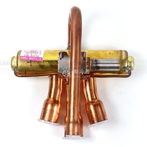 四通換向閥主要由四通氣動換向閥(主閥)、電磁換向閥(控制閥)及毛細管組成。閥內由滑塊、活塞組成活動閥芯,主閥閥體兩端有通孔可使兩端的毛細管與閥體內空間相連通,滑塊兩端分別固定有活塞,活塞兩邊的空間可通過活塞上的排氣孔相通??刂崎y由閥體和電磁線圈組成。閥體內有針型閥芯。主閥與控制閥之間有三根(或四根)毛細管相連,形成四通換向閥的整體。