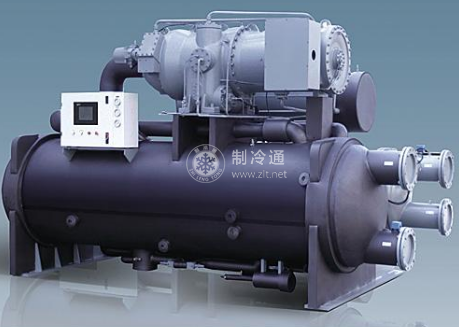 三級離心式冷水/熱泵機組。當處于制冷模式時。液體制冷劑沿蒸發器長度方向,通過分配器上的小孔(在筒體的整個長度上)均勻地噴淋到每根蒸發管上。在此,液體制冷劑從蒸發管內循環水中充分吸熱并氣化。然后通過了擋液裝置(除去氣體中的液態制冷劑液滴),經過第一級可調進口導葉后進入第一級葉輪。來自第一級葉輪的壓縮氣體流經第二級固定的進口導葉,進入第二級葉輪。在此,制冷劑氣體又被壓縮,然后通過第三級可調進口導葉,進入第三級葉輪。