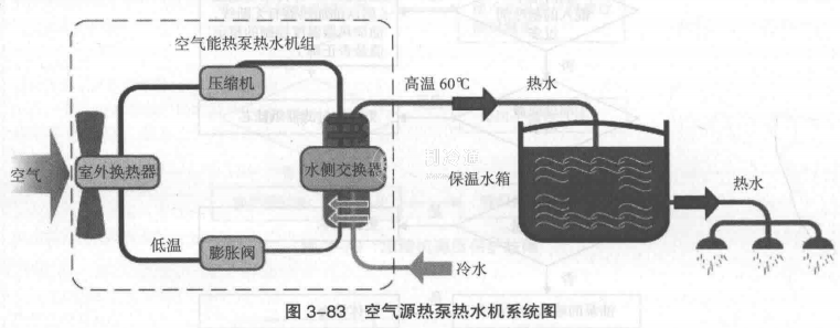 (1)系統原理。空氣源熱泵熱水機是與空氣作為低溫熱源、以少量電能為驅動力、以制冷劑為載體源源不斷地吸收空氣或自然環境中難以利用的低品位熱能,將其轉化為高品位熱能,實現低溫熱能向高溫熱能的轉移。再利用高品位熱能制取熱水,通過熱水供應管路輸送給用戶滿足熱水供應、供暖需求(圖3-83)。