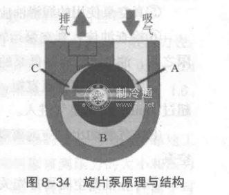 旋片泵主要由泵體、轉子、旋片、端蓋、彈簧等組成。在旋片泵的腔內偏心地安裝一個轉子,轉子外圓與泵腔內表面相切(二者有很小的間隙),轉子槽內裝有帶彈簧的兩個旋片。旋轉時,靠離心力和彈簧的張力使旋片頂端與泵腔的內壁保持接觸,轉子旋轉帶動旋片沿泵腔內壁滑動。兩個旋片把轉子、泵腔和兩個端蓋所圍成的月牙形空間分隔成A, B, C三部分,當轉子按順時針方向旋轉時,與吸氣口相通的空間A的容積是逐漸增大的,正處于吸氣過程。而與排氣口相通的空間C的容積是逐漸縮小的,正處于排氣過程。居中的空間B的容積也是逐漸減小的,正處于壓縮過程。由于空間A的容積是逐漸增大(即膨脹),氣體壓力降低,泵的入口處外部氣體壓力大于空間A內的壓力,因此將氣體吸入。當空間A與吸氣口隔絕時,即轉至空間B的位置,氣體開始被壓縮,容積逐漸縮小,最后與排氣口相通。當被壓縮氣體超過排氣壓力時,排氣閥被壓縮氣體推開,氣體穿過油箱內的油層排至大氣中(圖8-34)。由泵的連續運轉,達到連續抽氣的目的。如果排出的氣體通過氣道而轉入另一級(低真空級),由低真空級抽走,再經低真空級壓縮后排至大氣中.即組成了雙級泵。這時總的壓縮比由兩級來負擔,因而提高了極限真空度。
