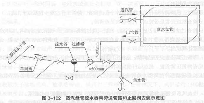 e.對于不允許中斷供汽的生產用熱設備,為了檢修疏水器,應安裝旁通管和閥門,但盤管運行中不應打開旁通管,以防止蒸汽竄入回水系統(圖3一102)。