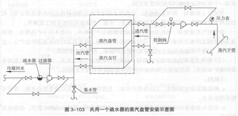 g.兩個以上蒸汽盤管安裝,當每個盤管的容量和壓力損失相同,且由同一個控制閥調節時,可共用疏水器,如圖3一103所示。