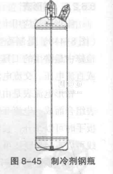 鋼瓶是儲(chǔ)存和運(yùn)輸制冷劑的專用容器,屬于二類低壓液化氣體容器(圖8-45)。由于各種制冷劑在常溫下的飽和壓力不同,對(duì)鋼瓶耐壓程度的要求也不同。鋼瓶外一般都標(biāo)有制冷劑的種類和瓶重,不同的制冷劑只能使用不同標(biāo)志的規(guī)定鋼瓶盛裝,不能隨便混用。鋼瓶中制冷劑的存儲(chǔ)量要根據(jù)鋼瓶容積來(lái)決定,不可超過(guò)限額,一般充裝量以鋼瓶容積的2/3為宜,以免遇熱膨脹后壓力增大而爆裂。回收制冷劑時(shí)鋼瓶應(yīng)得到充分的冷卻。