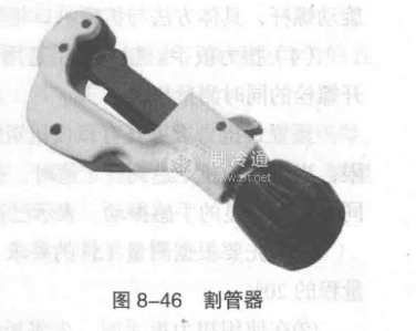 割管器也稱割刀,是用來切斷黑色或有色金屬等管的專用工具,由刀片、滾輪、螺桿、滾輪卡子、旋鈕和支架刮刀組成(圖8-46)。切割時(shí)將金屬管放在割刀與滾輪之間,割刀與管子垂直夾緊,緩慢旋動(dòng)調(diào)整鈕至刀刃碰到管壁,隨即均勻地將割刀整體繞金屬管旋轉(zhuǎn),每轉(zhuǎn)一圈就順擰調(diào)整鈕1/4圈,這樣邊轉(zhuǎn)邊進(jìn)刀,直到將管子割斷。割斷后的管口一般形成內(nèi)縮的銳邊,一定要使管口趨下,用割管器上的鉸刀將銳邊倒棱毛刺去掉,以防止金屬屑進(jìn)入制冷系統(tǒng)。毛細(xì)管切割比較簡單,一般夾住毛細(xì)管來回轉(zhuǎn)動(dòng)劃出裂痕,然后用手輕輕地折斷即可。