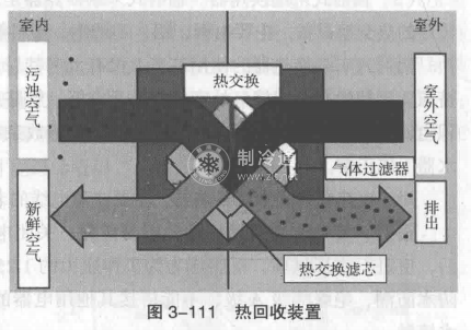 熱回收裝置(圖3-111)用于回收空調系統排風的冷量或熱量,減少系統的能源消耗。
