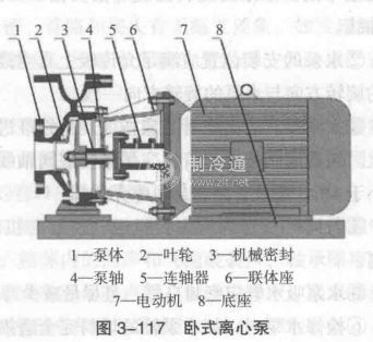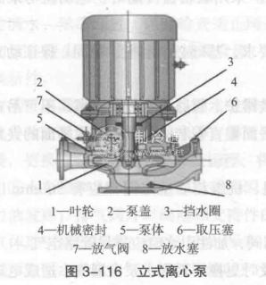 離心泵組成比較簡單,主要由四部分構成:電動機、葉輪、泵殼與軸封裝置。綜上所述,離心泵是在葉輪高速旋轉所產生的離心力的作用下,將水提到高處的,故稱離心泵(圖3-116和圖3-117)。