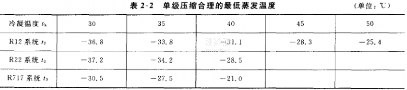 由于冷藏、生產及實驗等需要,對制冷溫度要求越來越低。在單級壓縮制冷循環中,選擇適用的制冷劑,其最低的合理蒸發溫度如表2-2。