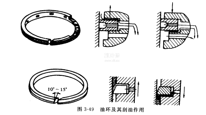 ②油環。油環與氣環的主要區別是在環的橫向上(徑向)有回油孔。老式油環無回油孔,但外側做成斜坡面。前者刮油效果好,后者刮油效果差。見圖3-49。