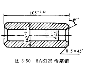 ③活塞銷。活塞銷受力嚴重,應有足夠的強度、耐磨性、抗疲勞、抗沖擊性能.其形狀如圖3-50。當用20鋼或20Cr鋼制造時,表面需進行滲碳處理,若用45鋼時,表面要淬火,使其硬度達到H RC57-66,并要有一定的韌性。為減輕重量,根據力學特性.將其中心部分抽掉,呈中空的圓往體。