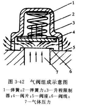 氣閥工作時,當閥片下面的氣體壓力大于閥片上的氣體壓力、彈簧力和閥片重力之和時,閥片開啟,升到限制器,氣體通過;當閥片下面的氣體壓力比閥片上面的氣體壓力、彈簧力及閥片重交和小時,閥片向下運動至緊貼在閥座密封面上,關閉氣體通道,隔離開高壓和低壓區,見圖3-42。