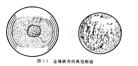 鋼制零件產(chǎn)生疲勞時,其特點是斷裂的面上出現(xiàn)兩個區(qū)域(圖5-1),斷面平整的區(qū)域表示顯微裂紋縱向發(fā)展的過程,斷面粗糙的區(qū)域附有破淬的金屬結(jié)晶,說明斷裂前零件最后受力的斷面。