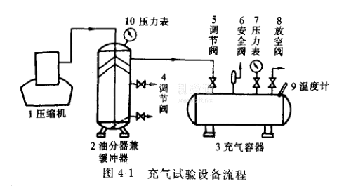 ③詳細觀察緩沖器上的壓力表10的數值;當氨機為0. 4MPa表壓或當氟機為0. 3MPa時,開啟閥5并調節閥5,使其一方面向充氣容器內充氣,同時維持緩沖器上的壓力值;在開啟閥5的同時啟動秒表計時,此時為t始。