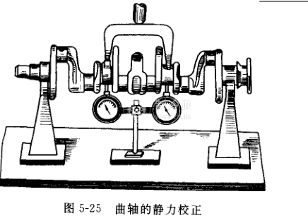 校正方法:可采用靜力校正法,將曲軸架在平板上的V形鐵架上,在中間一道主軸頸或曲柄頸的擬加壓部位下部立好千分表(最好把千分表的觸點立在被加壓軸頸的頸向端部,借以觀察各次加壓時的壓變量),然后分段緩慢地增加壓力,如圖5-25所示。