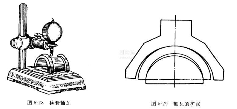 ③檢修及修整鋼背 鋼背的分界面應十分平整,與背面的不平行度不能大于0. 05mm(圖5-28),與背面高度不夠時,絕對不允許在背面墊薄紙片,應用堆焊來解決。軸瓦在澆鑄前應該擴張,因合金在冷卻時會使鋼背收縮一般擴張量為0.4~0.6mm(如圖5-29)。