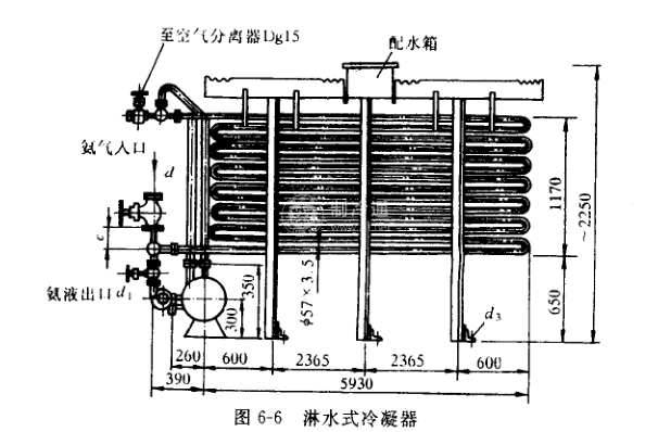 這種冷凝器結構比較簡一單,可以就地加工,分組進行檢修,而不影響生產,較適用于氣溫較低、濕度較低的地區。但是它的占地面積較大,且易受氣候條件的影響,當空氣相對濕度較大時,其效率大大降低。另外.冷卻水的循環量必須較大,故水泵動力費用也較大。