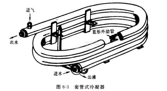 套管式冷凝器是由兩種不同直徑的管子套裝一起盤成圓形或橢圓形。蒸氣從上方進入兩管之間夾層空間,在內管外表面凝結為液體并依次流下,最后從下面出液管出液。而冷卻水需根據逆流熱交換形式連接,從中心管下端口進,吸熱后從上端出口流出,見圖6-3。