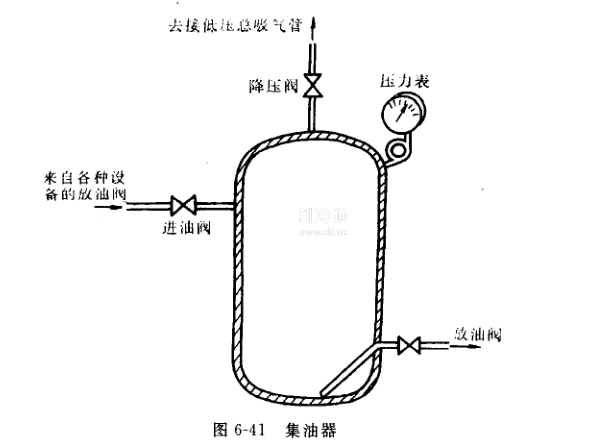 在氨為制冷劑的系統中,由于氨不溶解于油,需要經常排放潤滑油。利用氨比潤滑油輕的原理,在壓力差的作用下,使系統中的油經專門的放油裝置—集油器排放出。圖6-41為氨制冷系統中的集油器一般地講,它在全系統的各個設備中是安裝標高最低的一種設備,應該安裝在室外通風最好有陽光直射的位置。