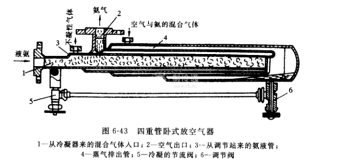 氨系統(tǒng)放空氣是在壓縮機(jī)運(yùn)行情況下進(jìn)行。放空氣的選擇:不論氨壓縮機(jī)臺(tái)數(shù)多少,每個(gè)機(jī)房只需裝設(shè)一臺(tái)空氣分離器。圖6-43為四重管臥式空氣分離器,其原理和操作方法幾乎和立式完全一樣,只是尚無(wú)自動(dòng)控制。