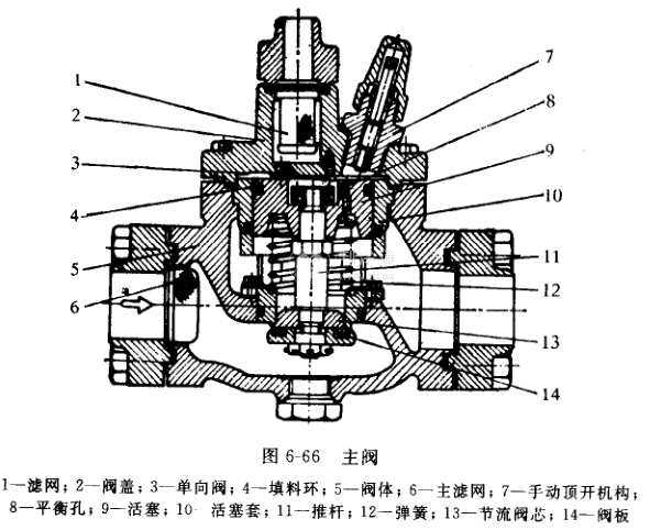 主閥的結構見圖6-66,主要零件有:閥體、閥蓋、閥芯、活塞桿、活塞、活塞套和彈簧等。閥體上(或閥蓋上)有手動頂桿,必要時可用頂桿將活塞頂起,使常閉型主閥閥芯開啟;常開型主閥必要時也可以用頂桿將閥芯關閉,活塞上有直徑lmm的平衡孔。