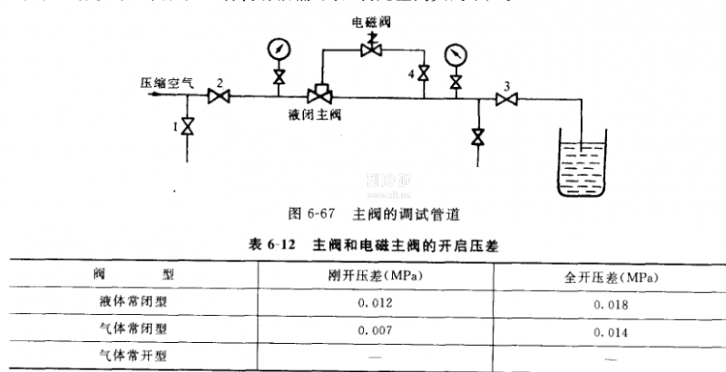 主閥性能試驗如圖6-67所示,主要檢驗在規定的壓差(見表6-12)時,能否開啟或關閉。閥2和閥3為主管調壓閥,閥1為旁通閥。當管路有滲漏時,可用閥4來鑒別是主閥漏還是導閥漏。當閥4關閉后,如主管仍有泄漏,則證明是主閥關閉不嚴。