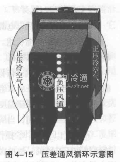 壓差通風(fēng)系統(tǒng)。壓差通風(fēng)裝置位于箱體側(cè)壁,冷風(fēng)機(jī)位于箱體頂板,自動卷簾覆蓋于果蔬箱上部和前部。預(yù)冷過程中果蔬箱上和前部形成正壓區(qū),使果蔬包裝箱或筐相對兩側(cè)產(chǎn)生壓力差,從而構(gòu)成壓差通風(fēng)循環(huán),如圖4-15所示。壓差風(fēng)機(jī)采用不銹鋼或鋁制葉輪風(fēng)機(jī)。配用防水電動機(jī),壓差風(fēng)機(jī)多臺并聯(lián),每組可分別開關(guān)。自動卷簾采用管狀電動機(jī)自動收卷,無線控制,每臺可單獨(dú)控制。整個系統(tǒng)冷卻效果好且預(yù)冷處理量大,操作方便。