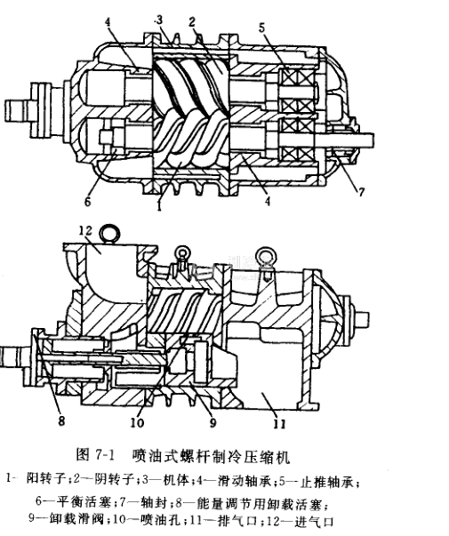 開啟式螺桿壓縮機結(jié)構(gòu)如圖7-1所示,其主要特點是有一對壓縮氣體的陰陽轉(zhuǎn)子2和1,在機體(氣缸)3的兩端不設(shè)吸氣閥和排氣閥.而只有吸氣口和排氣口,能最調(diào)節(jié)用卸載活塞8和滑閥9組成卸載裝置,調(diào)節(jié)壓縮機的輸氣量,平衡活塞6用于平衡陽轉(zhuǎn)子產(chǎn)生的軸向力,防止軸向竄動,噴油孔10向氣缸里噴入潤滑油,起冷卻、潤滑和密封作用。