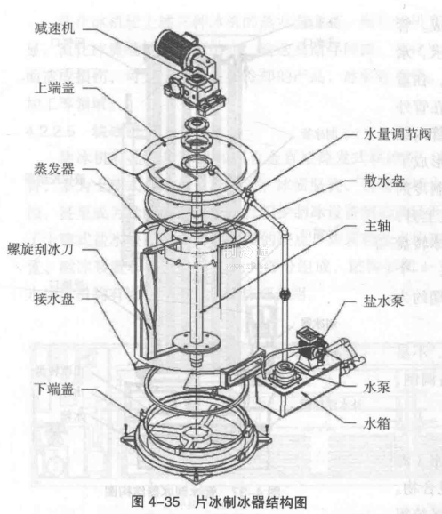 片冰制冰器典型結構圖4-35所示。制冰器由蒸發器、給水循環裝置及刮冰機構組成。水泵將水箱內的水抽至制冰器頂部并通過散水盤均勻地灑在蒸發器內壁。在制冷劑的蒸發作用下,水凍結成薄冰。減速機帶動螺旋刮冰刀沿著蒸發器內壁旋轉刮削,將片冰從壁上剝落。