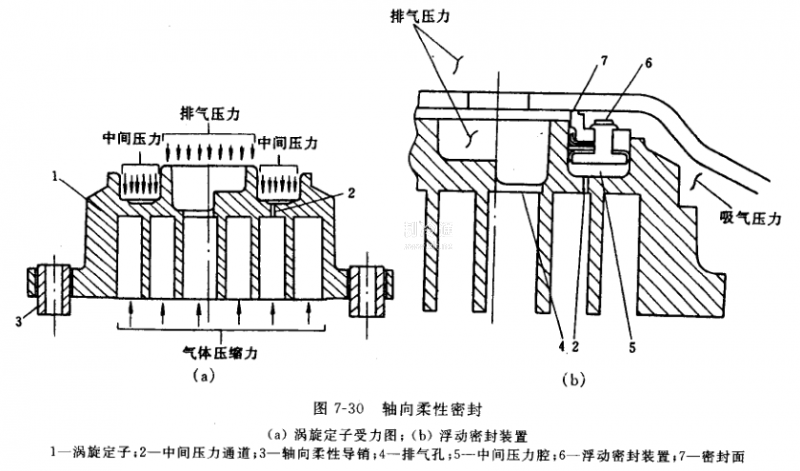 為了在渦旋定子頂部提供適當的氣體力,在渦旋定子L適當的中間壓縮室處開一中間壓力通道,見圖7-30(a),以提供中間壓力。在中間壓力腔5的上部設有浮動密封裝置6,見圖7-30(b),這樣在渦旋定子的上部作用有排氣壓力及中間壓力,除了平衡渦旋內部的壓縮氣體力外還提供了頂端和底槽間的密封力。軸向柔性導銷3是用以實現渦旋定子的軸向位移和承受傾覆力矩而設置的。