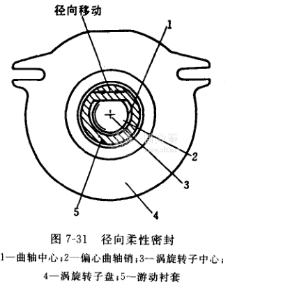 渦旋轉子與渦旋定子的徑向密封是指渦旋體側面嚙合點處的密封。徑向柔性密封是利用渦旋轉子的回轉離心力的作用來提供所需的側面密封力。在偏心銷2和渦旋轉子的中間設有游動襯套5(圖7-31),并有足夠的游隙,使渦旋轉子能在徑向有微小位移,以提供有限的柔性。對渦旋轉子離心力的大小,可通過加平衡重來調整,以防止離心力過大而增加摩擦損失和磨損;而離心力過小時,則不能產生足夠的側面密封力,使泄漏增加,從而增加了噪聲和使壓縮機性能惡化。徑向柔性密封同時具有排出固體雜質或液體制冷劑的能力,具有良好的抗濕行程的能力。