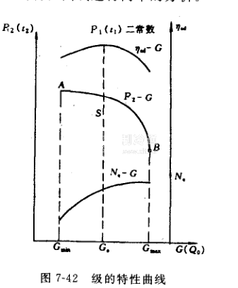 圖7-42為一個級的特性曲線。圖中S點為設計點,所對應的工況為設計工況。由流量一效率曲線可見,在設計工況附近,級的效率較高,偏離越遠,效率越低。