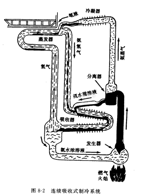 以氨為制冷劑,水為吸收劑,氫(也可以是氦)為擴散劑的制冷系統(圖8-2),能連續工作并制冷。由于氫(或氮)氣的存在,可以加速氨蒸氣在氫氣中的擴散速度,因此氫稱為擴散劑,而這種系統又稱為吸收一擴散式制冷系統。