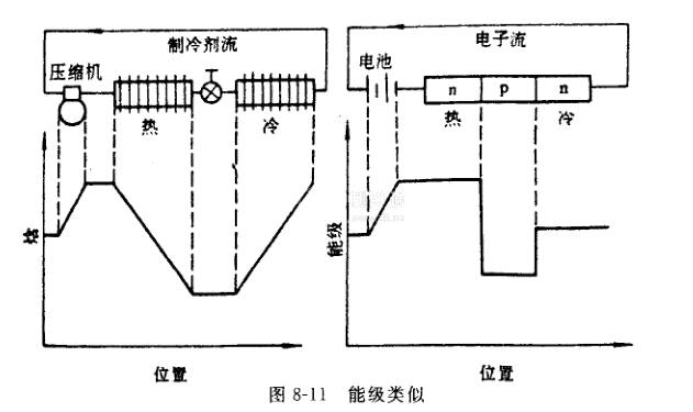 每個(gè)系統(tǒng)中,最重要的是熱邊和冷邊內(nèi)能改變的方法。對于蒸氣壓縮循環(huán),節(jié)流閥是使能量變化的設(shè)備。當(dāng)制冷劑離開冷凝器時(shí),它是處在高壓和中等溫度下的飽和液體,當(dāng)制冷劑通過節(jié)流閥時(shí),它絕熱等焓膨脹。因此,制冷劑是作為低壓、低溫、低質(zhì)量的蒸氣而離開節(jié)流閥,而且處于最低的能級狀態(tài)。這使制冷劑在蒸發(fā)過程中能吸收大量的熱。沒有節(jié)流閥,壓力就不變,制冷劑的熔就不變,也就不會出現(xiàn)“抽熱”。在熱電制冷系統(tǒng)中的類似部分是P型和n型半導(dǎo)體材料中電子能量的差,假若整個(gè)系統(tǒng)電子能級相同,也就不會出現(xiàn)“抽熱”。兩種系統(tǒng)的能級圖示于圖8-11。
