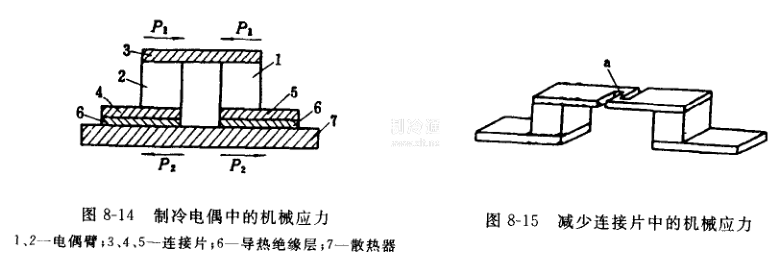 首先,在制冷電偶的結構設計中要消除或減少機械應力,這種應力是由于冷端連接片的收縮或熱端連接片的膨脹所引起的。例如圖8-14所示的制冷電偶,冷端連接片3、熱端連接片4,5及散熱器7都由導電和導熱性好的材料制成,它們具有較大的線膨脹系數。因此,在制冷電偶的工作過程中,由于連接片3的收縮而產生一對壓縮應力P1,而在散熱器7上產生一對,拉伸應力P2,這些應力最終可能會導致熱電堆的損壞。