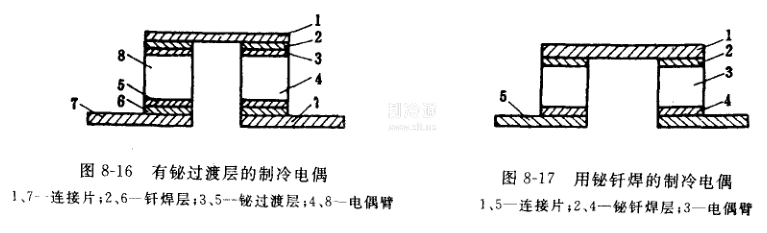 圖8-16是在電偶臂上涂秘的結構,先在臂4和8的兩個端面上涂一層鉍,然后再與連接片1和7用低熔點釬料焊成一體,鑄過渡層的厚度不應超過0.2-0.3mm,否則會增加電阻。