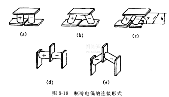 為了適應各種熱電制冷器對形狀和性能的要求,制冷電偶的連接可采用各種不同的幾何形狀,如圖8-18所示。電偶臂通常采用圓形或正方形截而.在某些特殊場合下也可能采用長方形或環形截面。圖中((a)是單級熱電堆最常用的連接方式,兩臂與連接片垂直:(b、c)和(e)是特殊形式。臂和連接片成一定的角度,這種結構往往是為了縮短兩塊連接片之間的距離。減少熱電堆的厚度,同時又可增加電偶臂的長度,以增加冷熱端的溫差;(d)一般用于多級熱電堆中。