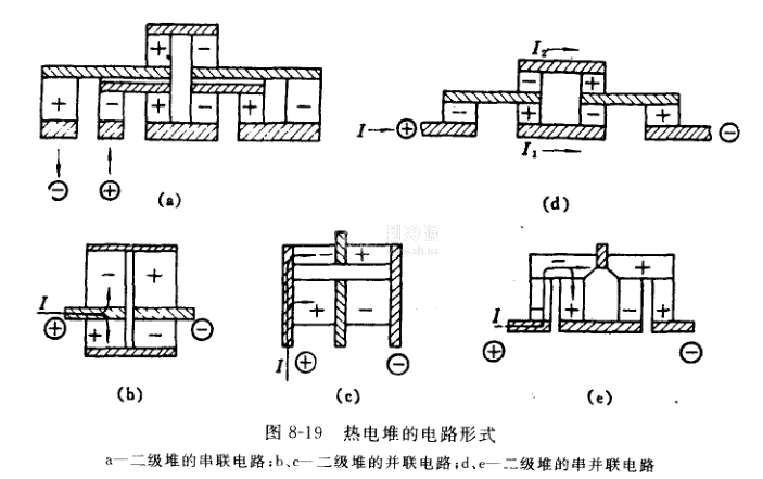 在多級熱電堆中,電路可以布置成級間串聯(lián)、并聯(lián)或串并聯(lián).以滿足電路設(shè)計上的要求。圖8-19為多級熱電堆中幾種常用的電路布置,其中(a)為最常見的二級堆串聯(lián)電路,(b、c)為二級堆并聯(lián)電路,(d、e)為串并聯(lián)混合電路。在這些電路中電偶臂的截面積往往是不相等的。它由級與級之間的制冷量分配所決定。圖中(e)是一種較為合理的特殊結(jié)構(gòu),它的一級的兩個臂作為二級的連接片,可以減少級間的熱阻,提高制冷效果,而它一級的連接片可做成點(diǎn)狀或針狀冷端,作為外科醫(yī)療器械或電子儀器的微型制冷器。