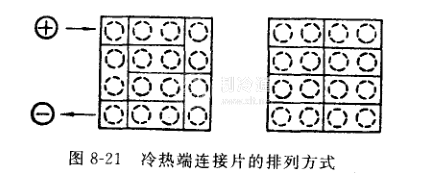 熱電堆實(shí)際是一種大電流、低電壓的器件,目前大多數(shù)熱電堆的工作電流為4至60A,而每個電偶的平均電壓約為0.1V。顯然,為得到實(shí)用的電壓降,一個熱電堆必須用若干個電偶串聯(lián)在一起,因此標(biāo)準(zhǔn)的熱電堆常采用能排成正方形或長方形的電偶數(shù),其數(shù)目為幾十甚至上百個不等。如圖8-21為一個由8個電偶組成的熱電堆,它的上、下連接片經(jīng)適當(dāng)組合后構(gòu)成了一個正方形,與半導(dǎo)體制冷元件焊接后可構(gòu)成一個串聯(lián)電路。