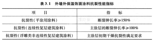 作為外墻外保溫系統(tǒng)的飾面涂料,其涂膜必須具有一定的抗裂性和一定的斷裂伸長(zhǎng)率,同時(shí)具有較好的耐溫變性和耐候性,才能起到應(yīng)有的裝飾和保護(hù)作用。外墻外保溫系統(tǒng)涂料外飾而中涂層應(yīng)具有一定的柔性變形能力,以緩和從面層及基層傳遞過(guò)來(lái)的應(yīng)力變形影響,起到良好的防裂作用。因此,外墻外保溫飾面涂料其性能除應(yīng)符合國(guó)家及行業(yè)相關(guān)標(biāo)準(zhǔn)外,還應(yīng)滿(mǎn)足表3.1列出的抗裂性要求。