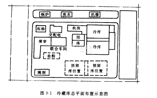 圖9-1是某冷藏庫總平面示意。大型冷藏庫的總平面甚至立面尚需符合當地的城市規(guī)劃要求,總平面的布置關系到投資和使用,因此要在綜合考慮的基礎上,認真研究論證.不能貪圖方便或簡單套用,也不能為了追求美觀而忽視合理的流程。