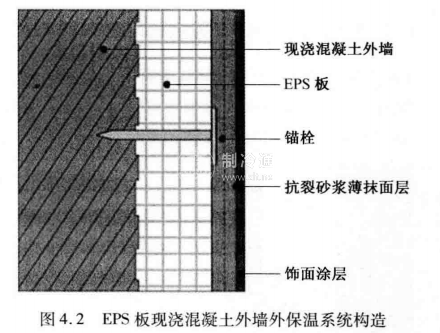 EPS板現(xiàn)澆棍凝土外墻外保溫系統(tǒng)以現(xiàn)澆混凝土外墻作為基層,EPS板為保溫層, EPS板內(nèi)表面(與現(xiàn)澆混凝土接觸的表面)沿水平方向有矩形齒槽。內(nèi)外表面均涂滿界面砂漿,在施工時(shí)將EPS板置于外模板內(nèi)側(cè),并安裝錨栓作為輔助固定件,澆灌混凝漿薄抹面層,外表以涂料為飾面層。EPS板現(xiàn)澆混凝土外墻外保溫系統(tǒng)構(gòu)造如圖4.2所示。