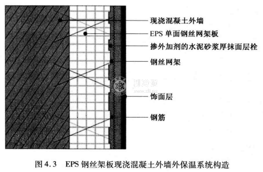 EPS鋼絲架板現(xiàn)澆混凝土外墻外保溫系統(tǒng)以現(xiàn)澆混凝土為墓層,EPS單面鋼絲網(wǎng)架板置于外墻外摸板內(nèi)側(cè),并安裝直徑為6 mm鋼筋作為輔助固定件。澆灌混凝土后,EPS單面鋼絲網(wǎng)架板挑頭鋼絲和直徑為6 mm鋼筋與混凝土結(jié)合為一整體,EPS單面鋼絲網(wǎng)架板表面抹摻外加劑的水泥砂漿形成厚抹面層,外表做飾面層。其系統(tǒng)構(gòu)造如圖4.3所示。